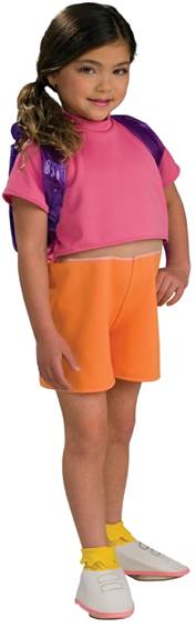 Licensed costume from the Dora the Explorer television show. Includes shirt, shorts, shoe covers and plastic backpack.