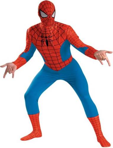 MARVEL LICENSED DELUXE SPIDERMAN COSTUME INCLUDES JUMPSUIT, FABRIC MASK AND BOOT COVERS. AVAILABLE STANDARD MEN'S SIZE.