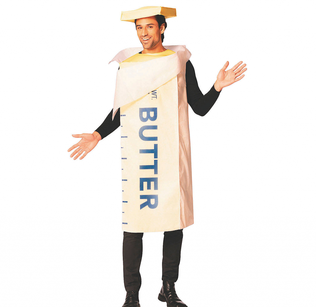 WARNING PUNS AHEAD....Stick another slab of butter on the pancakes, or on top of any other food to make your taste buds (and your heart) explode.Turn up the heat in our Stick of Butter costume for adults! This buttery-soft ensemble will have everyone spreading the compliments like it’s toast o’clock. The costume includes a foam tunic and a headpiece. The tunic is in the shape of a stick of butter and is printed on the sides and the front with "BUTTER" to remind everyone who’s really cooking. The headpiece is a 3D pat of butter hat. Whether you're melting hearts or just keeping it smooth, this costume is a dairy queen’s dream come true.
